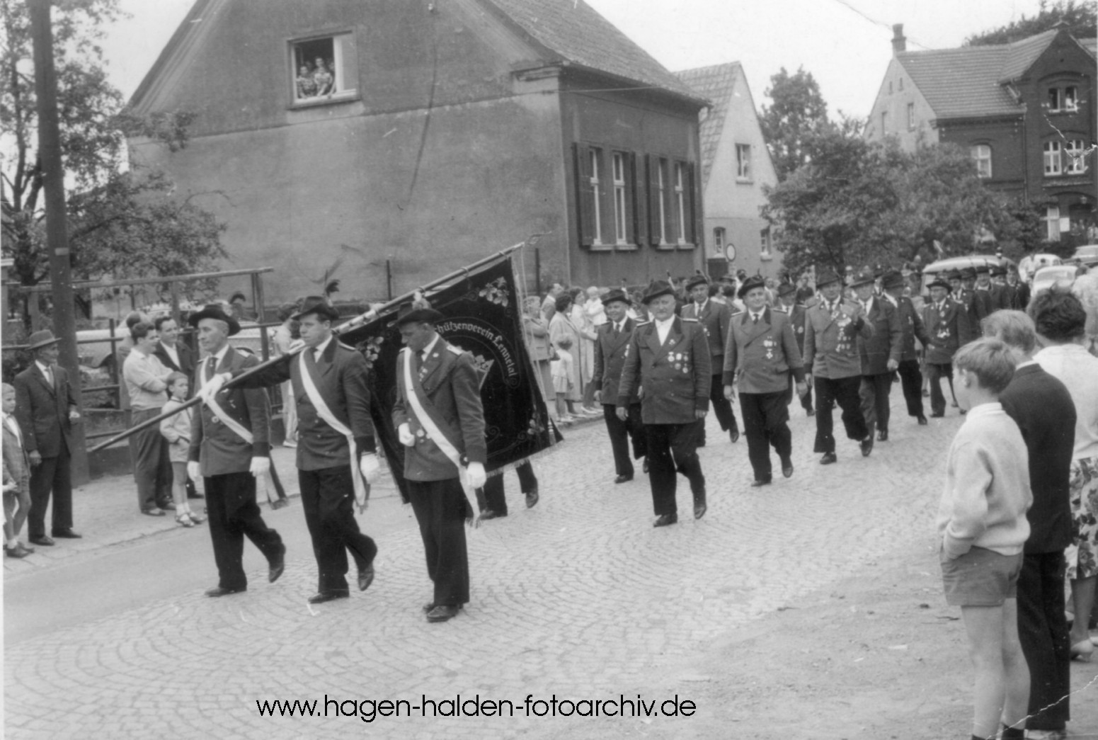 Schützenumzug (ca. Anfang der 60-er Jahre) auf der Berchumer Strasse (heute: ca. in Höhe des Restaurants Kornkammer)