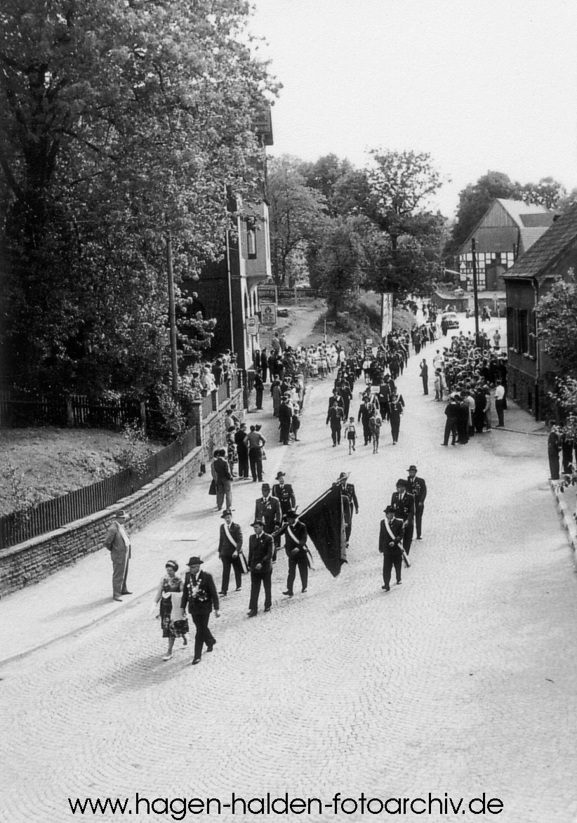 1950-er Jahre: Umzug der Lennetaler Schützen durch die Berchumer StrasseIn der Bildmitte rechts die Einmündung der Wehbergstrasse / im Hintergrund das Fachwerkgebäude des Hofes Hamann