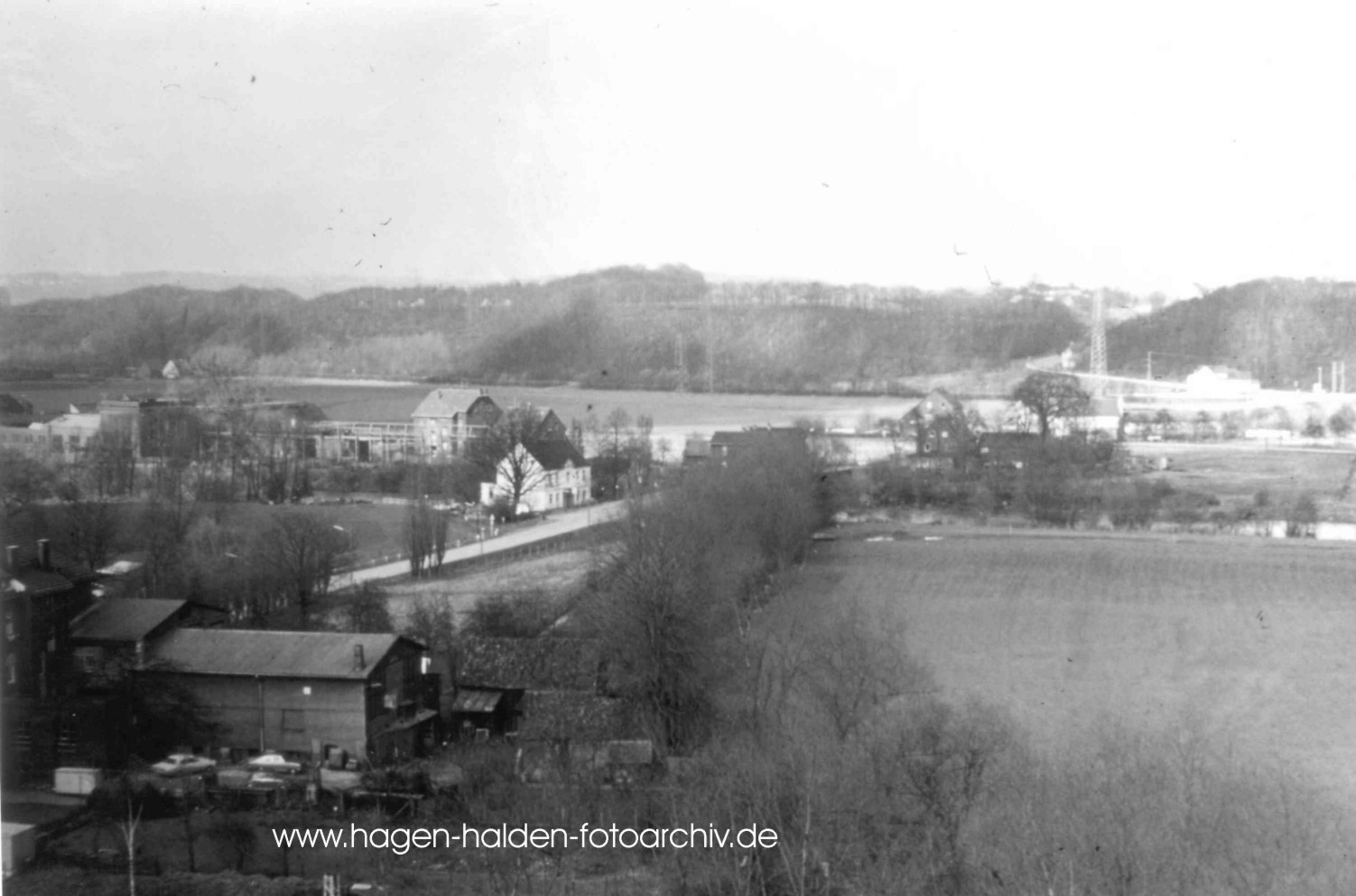 Das helle Haus links vom Zentrum ist die Gaststätte "Zum Treppchen" direkt an der alten Lennebrücke (1974)