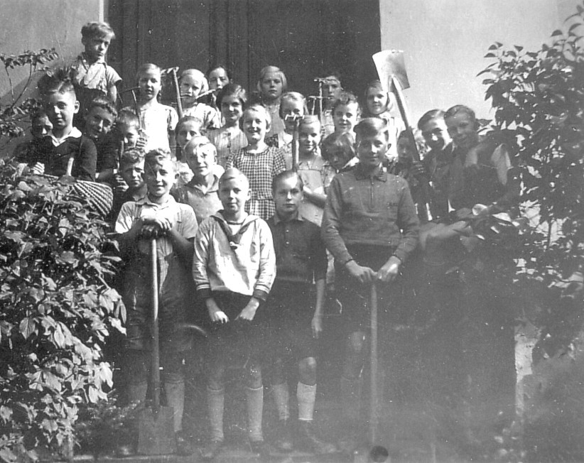 bereit für den Einsatz im Schulgarten - vor der Schule an der Sauerlandstrasse (ca. 1930-er Jahre)
