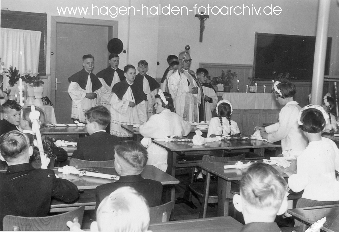 Pater Salvator und Kommunionkinder in einem Klassenzimmer (ca. 1950-er Jahre)