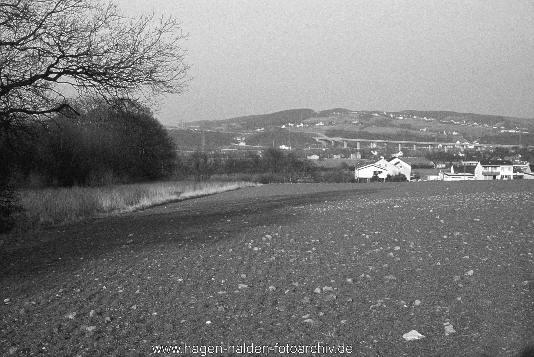 Blick von der Straße "Großer Kamp" Richtung Norden - die Häuser am Ende des Feldes stehen in der Odenwaldstraße (1975) >dasselbe Foto in Farbe<