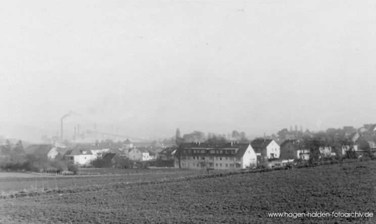 1967: Blick von der Straße "Im Alten Holz" über die unbebauten Felder in Richtung "Berchumer Strasse"In der Bildmitte die Rückseite des Wohn- und Geschäftshauses Berchumer Str. 49 - rechts daneben das Werkstattgebäude der ESSO-Tankstelle