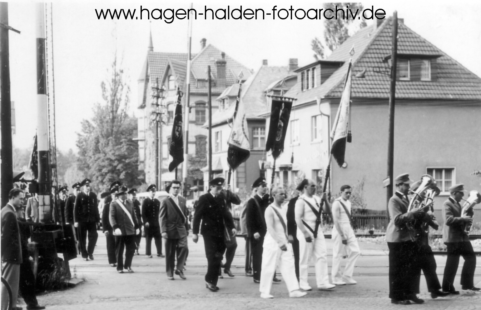 Am Haldener Bahnübergang: die Abordnungen der Haldener Vereine auf dem Weg zum Ehrenmal