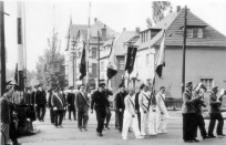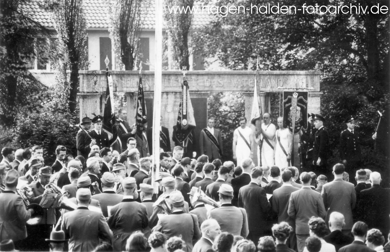 Ende der 1950-er Jahre: feierlicher Akt nach Anbringung der Tafeln mit den Namen der Haldener Gefallenen des 2. Weltkrieges unter Beteiligung von Abordnungen aller Haldener Vereine - siehe auch (anklicken zum Vergrößern):
