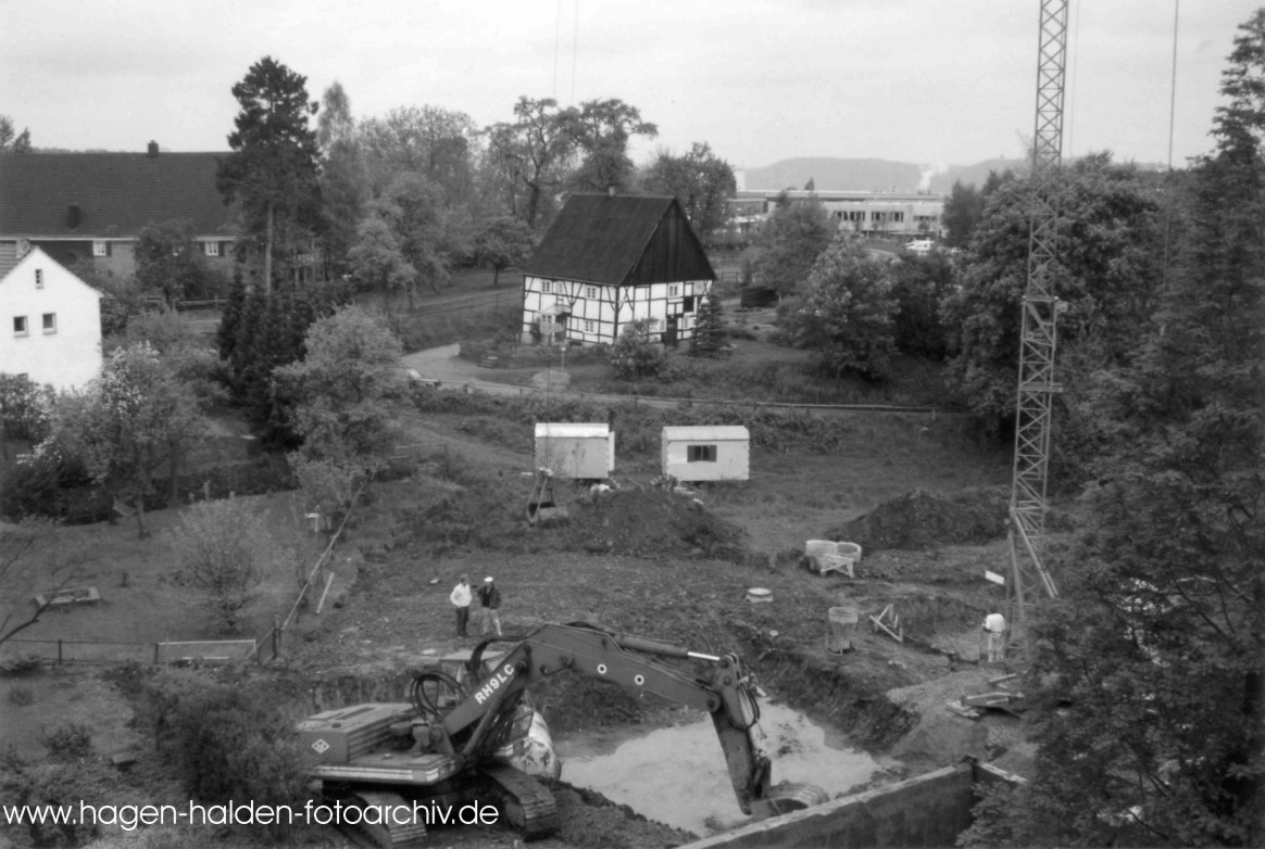 Blick vom Haus Gösselnhof Nr. 2 auf die Bauarbeiten auf dem ehemaligen Grundstück Nr. 3 / links das Haus Nr. 4 und der Hof Rehpenning / in der Mitte neben dem Fachwerkhaus ist die Einfahrt zum Feldmarkweg ( Frühjahr 1994)