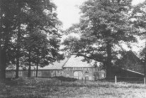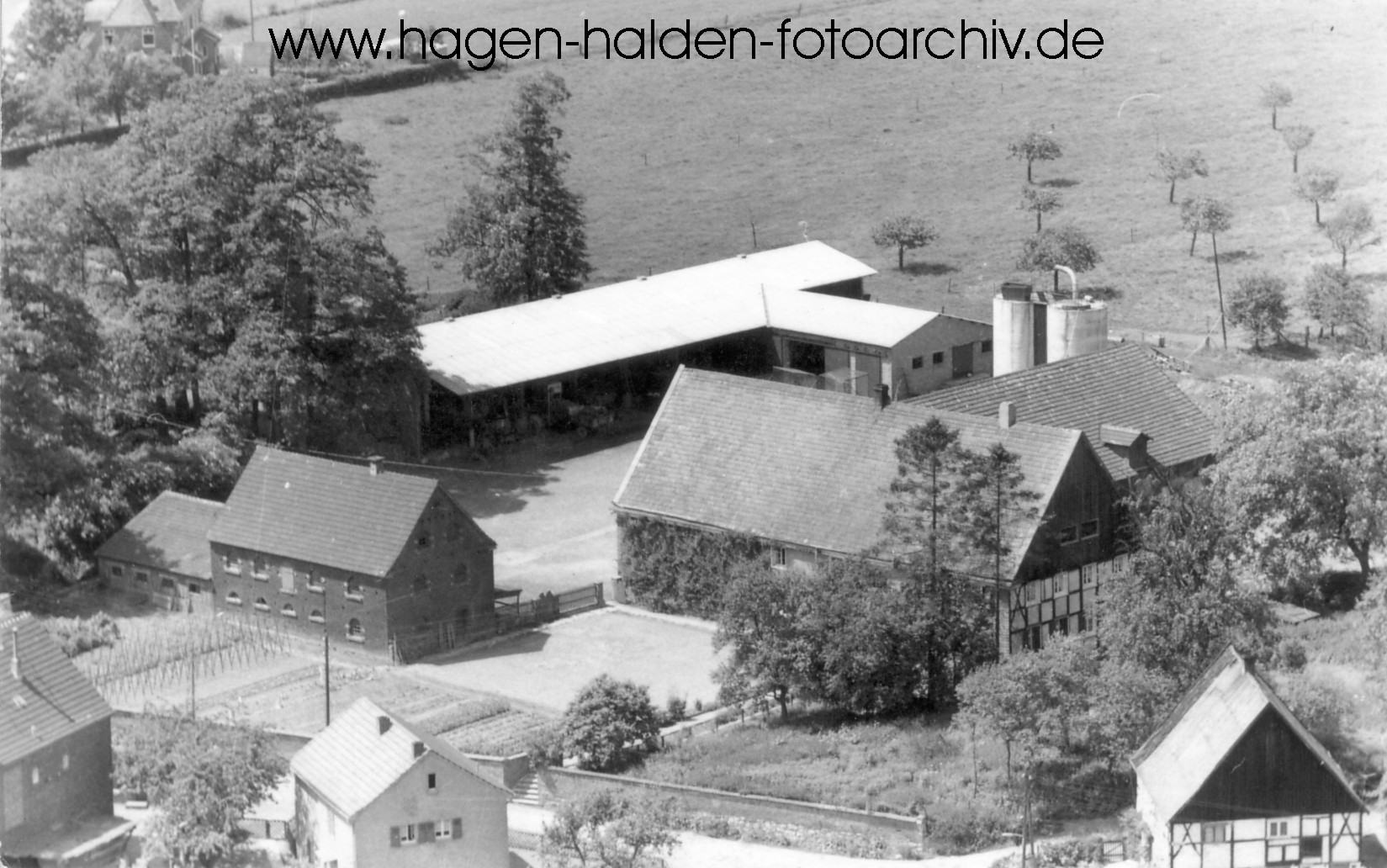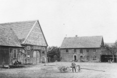 Luftaufnahme (ca. Anfang der 1960-er Jahre) des Hofes Rehpenning (historischer Schultenhof) - im Vordergrund die Wehbergstraße - (links von der Mitte befindet sich das Haus Nr. 4)