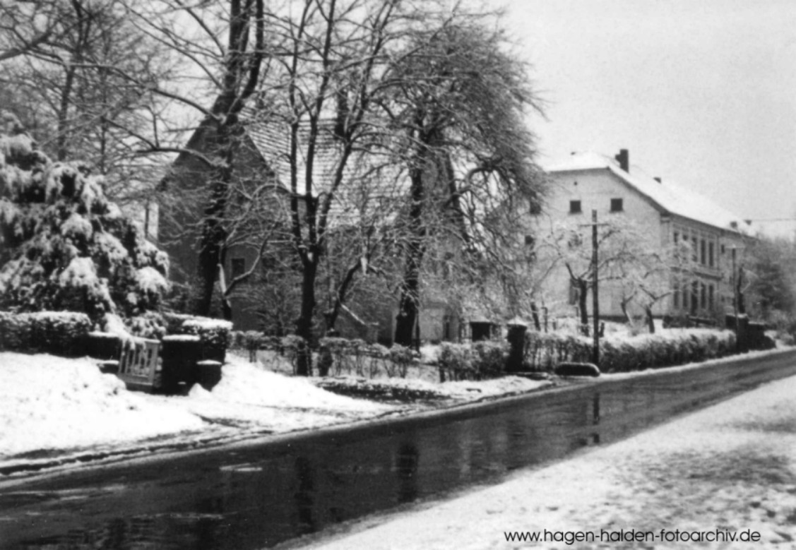 Die Berchumer Strasse im Februar 1960 - das rechte Gebäude ist das Hauptgebäude des Hofes Schnöring-Bungstock