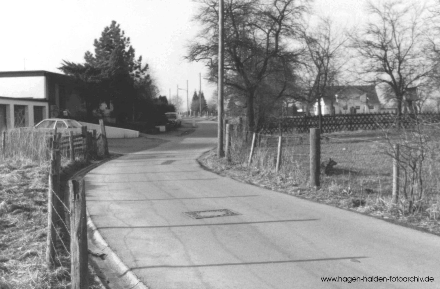 Der Rüggeweg im Jahr 1980 - der rechten Bildhälfte ist das Haus "Im Alten Holz Nr. 149" zu erkennen >dasselbe Motiv im Mai 2004<