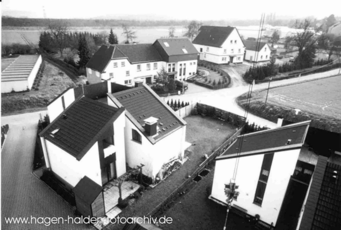 Aussicht vom Baukran auf die neu errichteten Häuser Ecke Lennestraße / Düsternstraße (Frühjahr 1989)