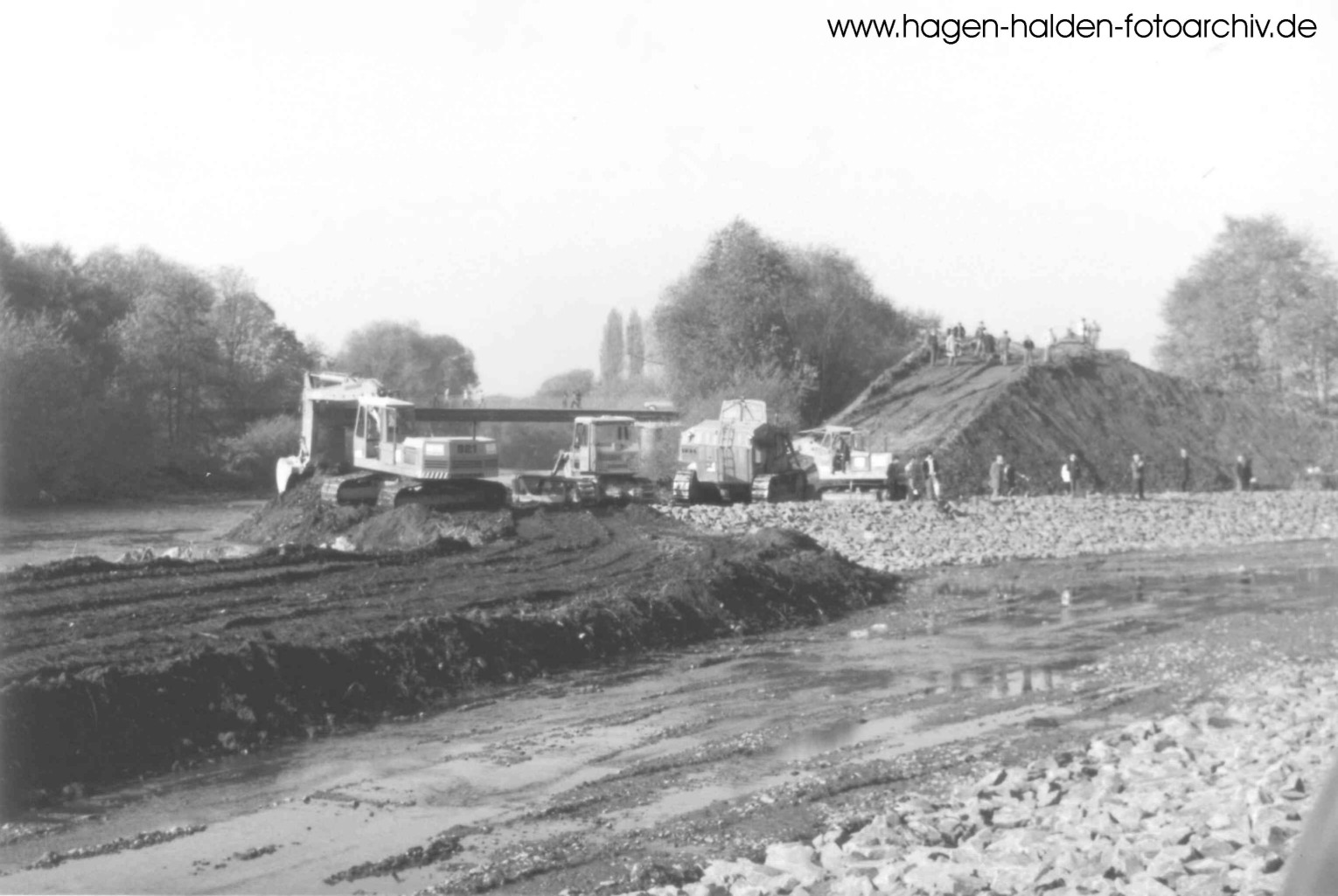 Im Vordergrund das neue Lennebett - noch abgeteilt durch einen Damm (in der Bildmitte die alte Brücke über die Lenne)