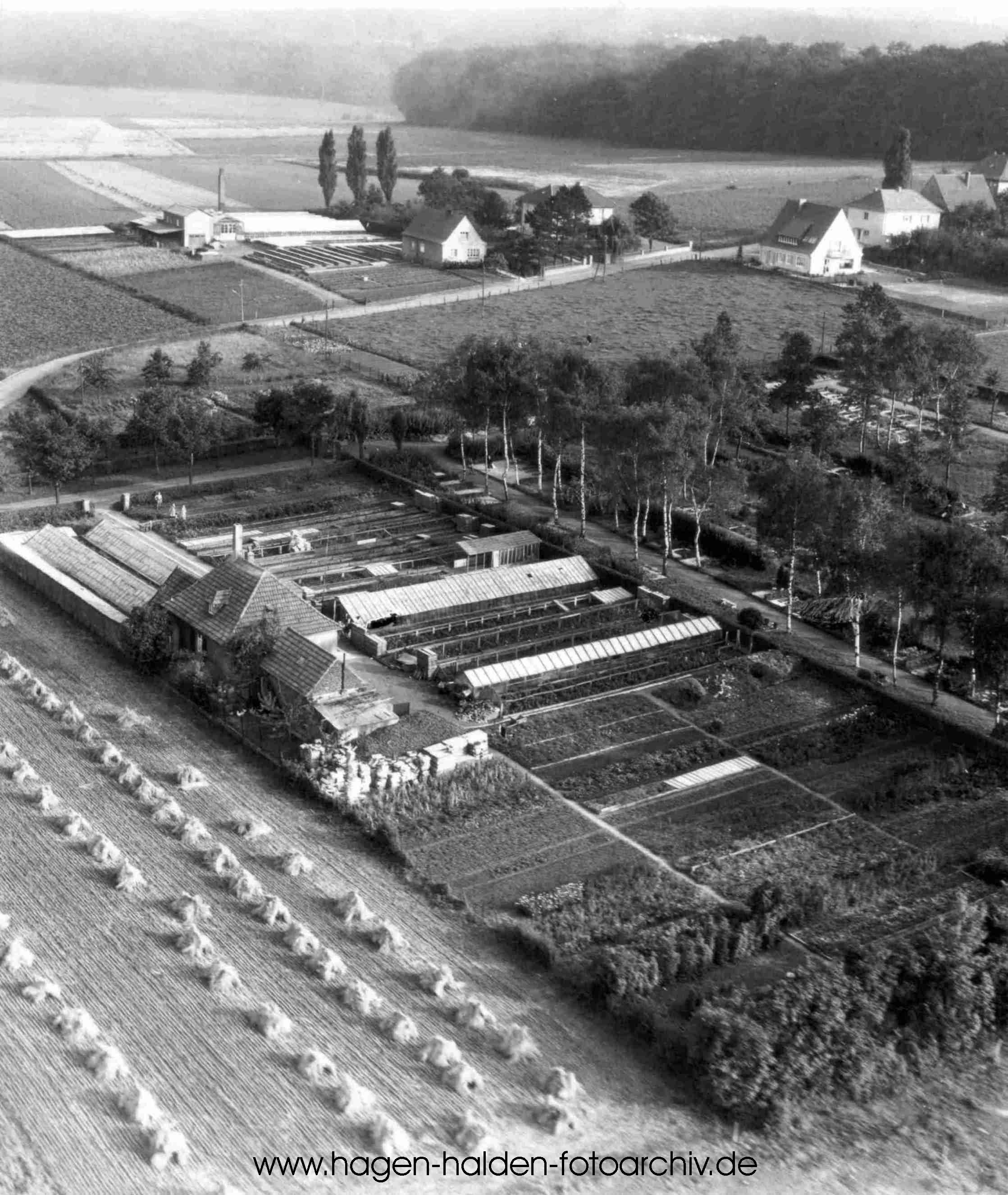 Luftbild von 1956: am oberen Bildrand die Gärtnerei Meier, rechts daneben die Villa Knippschild - im Zentrum die Gärtnerei Hömmerich/Göbel; daneben der Friedhof